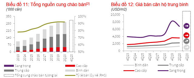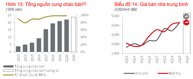 Dưới tác động của Covid-19, JLL ghi nhận một số dự án mở bán trước đại dịch đã phát hành chương trình khuyến mãi sau khi có động thái tăng giá nhẹ, giúp những dự án này có bình ổn mức giá so với quý trước. Tuy nhiên, một điều không thể phủ nhận là nguồn cung biệt thự tiếp tục bị hạn chế, chỉ bằng 50% so với trung bình hàng quý giai đoạn 2017 – 2018. Đối với phân khúc biệt thự, nhu cầu mua để ở vẫn gia tăng mạnh mẽ kèm theo mức giá bán xác lập kỷ lục mới với 5.277 USD/m2 (127 triệu đồng/m2), tăng 36% cùng kỳ năm trước và 5% quý liền trước. Nguyên nhân là các dự án mới ra mắt trong quý chào giá cao hơn mức trung bình, điều này một lần nữa khẳng định sự tự tin của chủ đầu tư trong giai đoạn nhu cầu cao và nguồn cung lại khan hiếm.