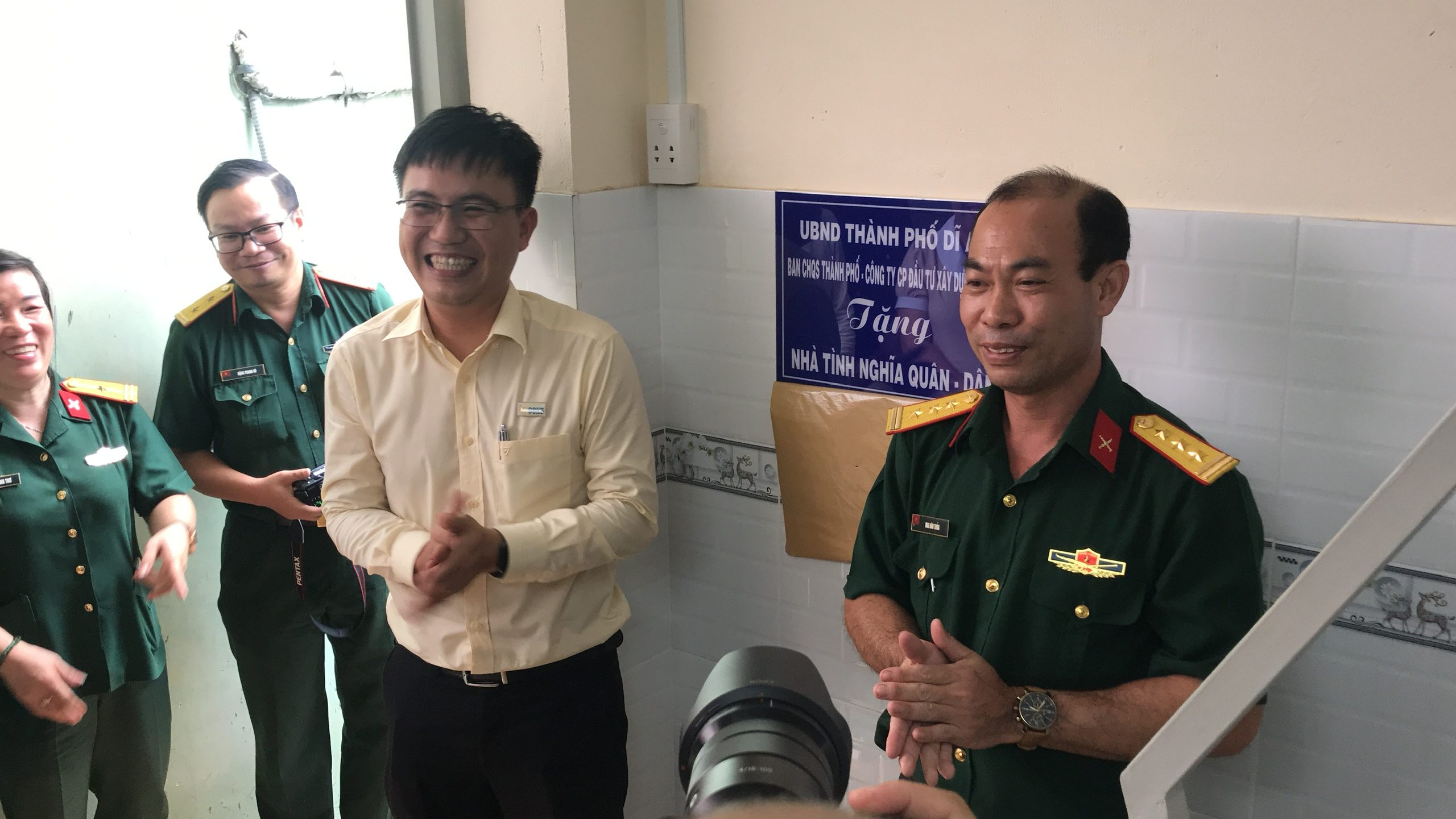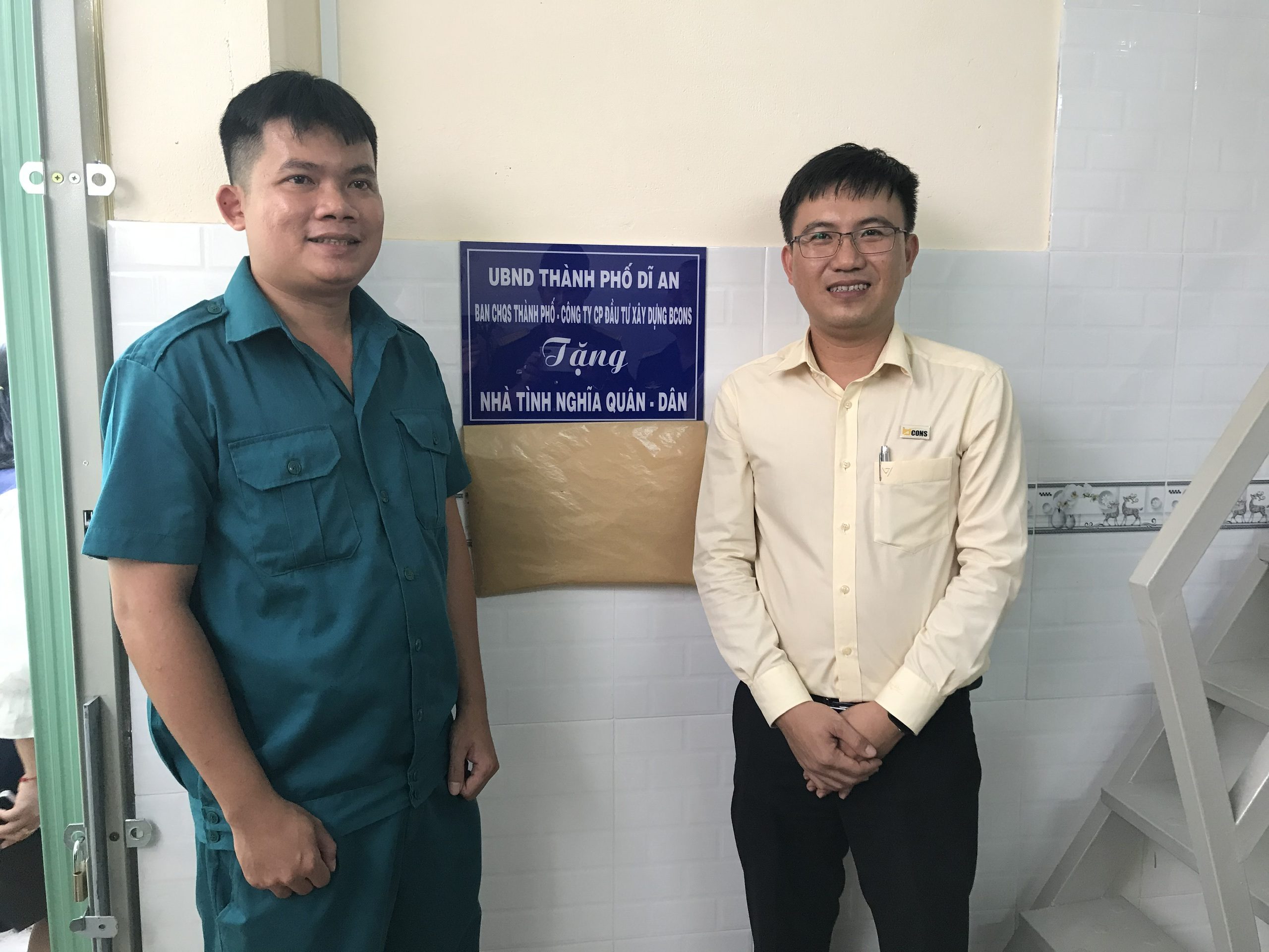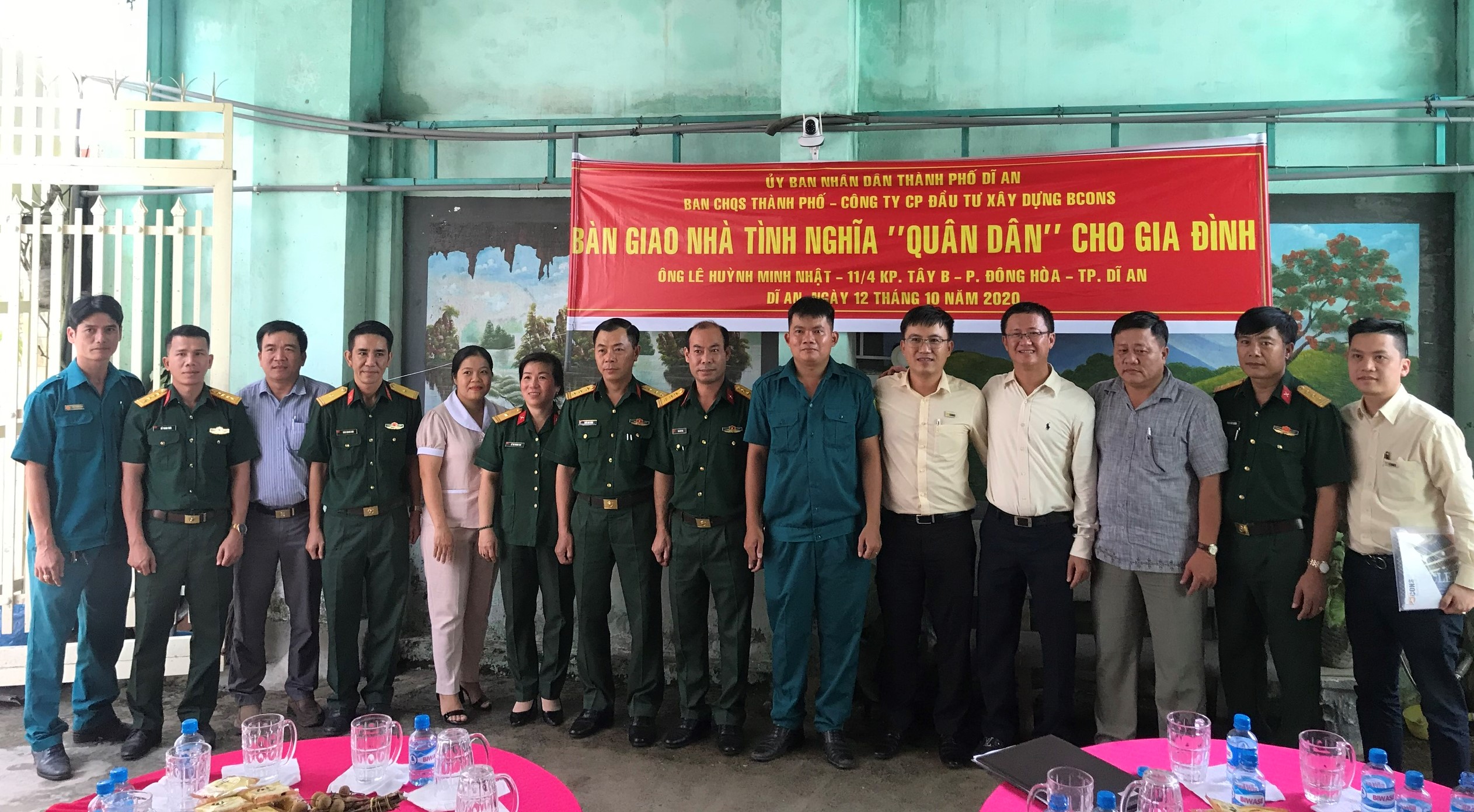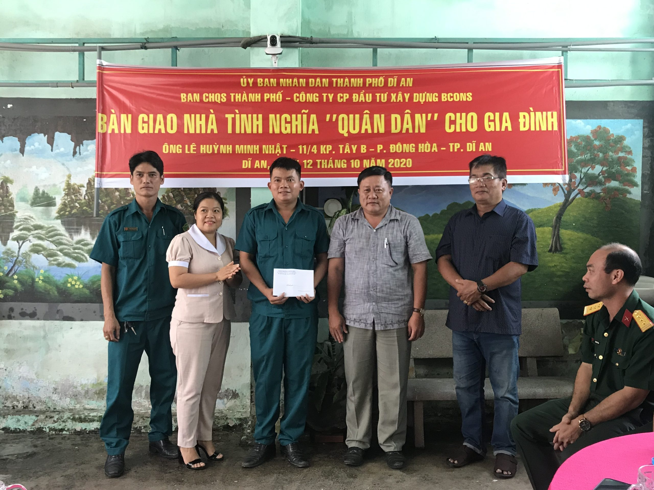Ngày 12/10/2020, Công ty Cổ phần Đầu tư Xây dựng BCONS phối hợp với Ban Chỉ huy quân sự thành phố Dĩ An vừa bàn giao nhà “Nghĩa tình Quân dân” cho ông Lê Huỳnh Minh Nhật – khu phố Tây B phường Đông Hòa, hiện là Trung đội trưởng Trung đội Dân quân thường trực của phường.