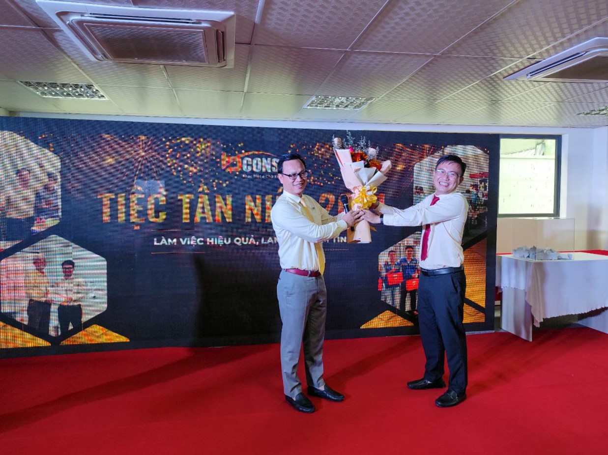 Ông Ngô Lưu Bình TGĐ công ty dành tặng bó hoa, thay lời cảm ơn của toàn thể CBNV BCONS đến Chủ tịch Lê Như Thạch, người đã lèo lái con thuyền BCONS vượt qua bao khó khăn, sóng gió của năm 2020. Đặt nền móng cho BCONS trở nên lớn mạnh, thành công và phát triển như thời điểm hiện tại.