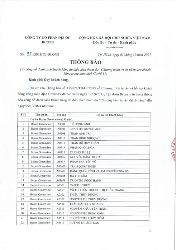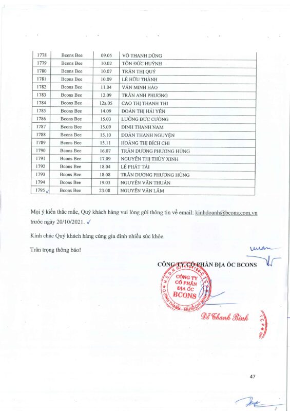 Tin nổi bật, Tin tức, Tin tức dự án Tập đoàn Bcons thông báo công bố danh sách khách hàng đủ điều kiện tham dự “Chương trình tri ân khách hàng” tính đến ngày 05/10/2021 Posted on 6 Tháng Mười, 20216 Tháng Mười, 2021 by Dương Thị Kiều Lam