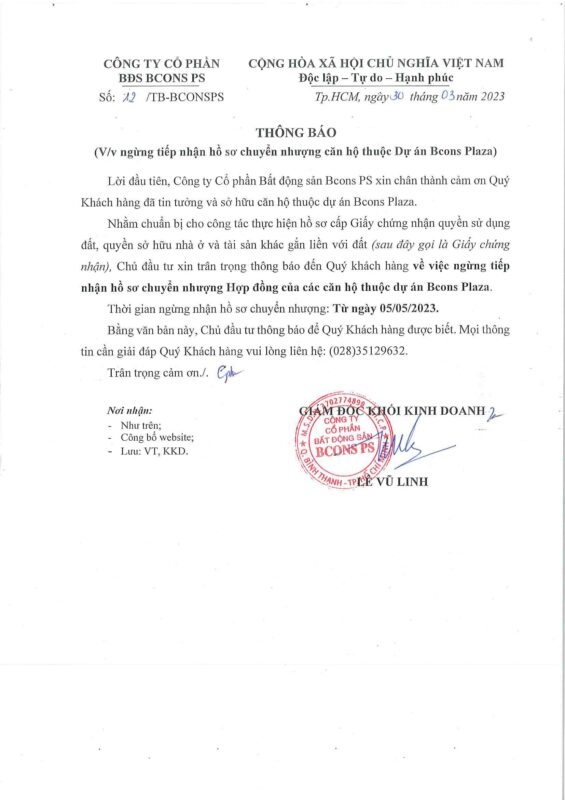 Tin tức, Tin tức dự án Tập đoàn Bcons thông báo ngừng tiếp nhận hồ sơ chuyển nhượng căn hộ thuộc Dự án Bcons Plaza Posted on 30 Tháng Ba, 2023 by Dương Thị Kiều Lam