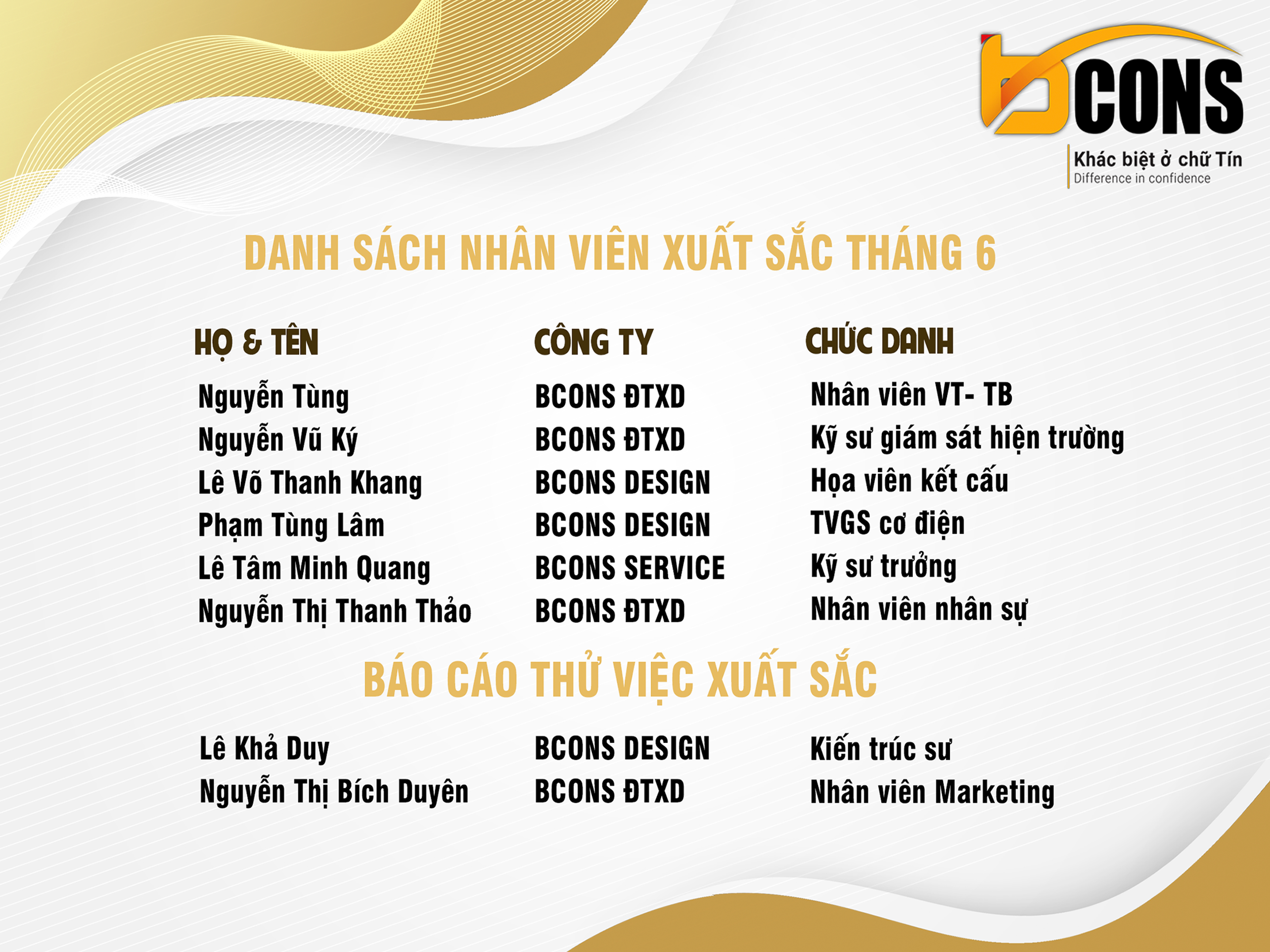 Tập đoàn Bcons trân trọng sự nỗ lực và cống hiến hết mình của các bạn cho sự phát triển chung của tập đoàn. Sức mạnh của tập thể được tạo nên bởi sự nỗ lực của mỗi cá nhân và Bcons tự hào vì có sự đóng góp tận tâm của các bạn trên con đường đưa Tập đoàn Bcons ngày càng lớn mạnh. Xin gửi lời chúc mừng đến những nhân viên đã đạt thành tích xuất sắc trong tháng 6, chúc cho các CB-CNV của Tập đoàn Bcons sẽ nỗ lực hơn nữa để đưa Bcons vươn xa và phát triển rực rỡ.