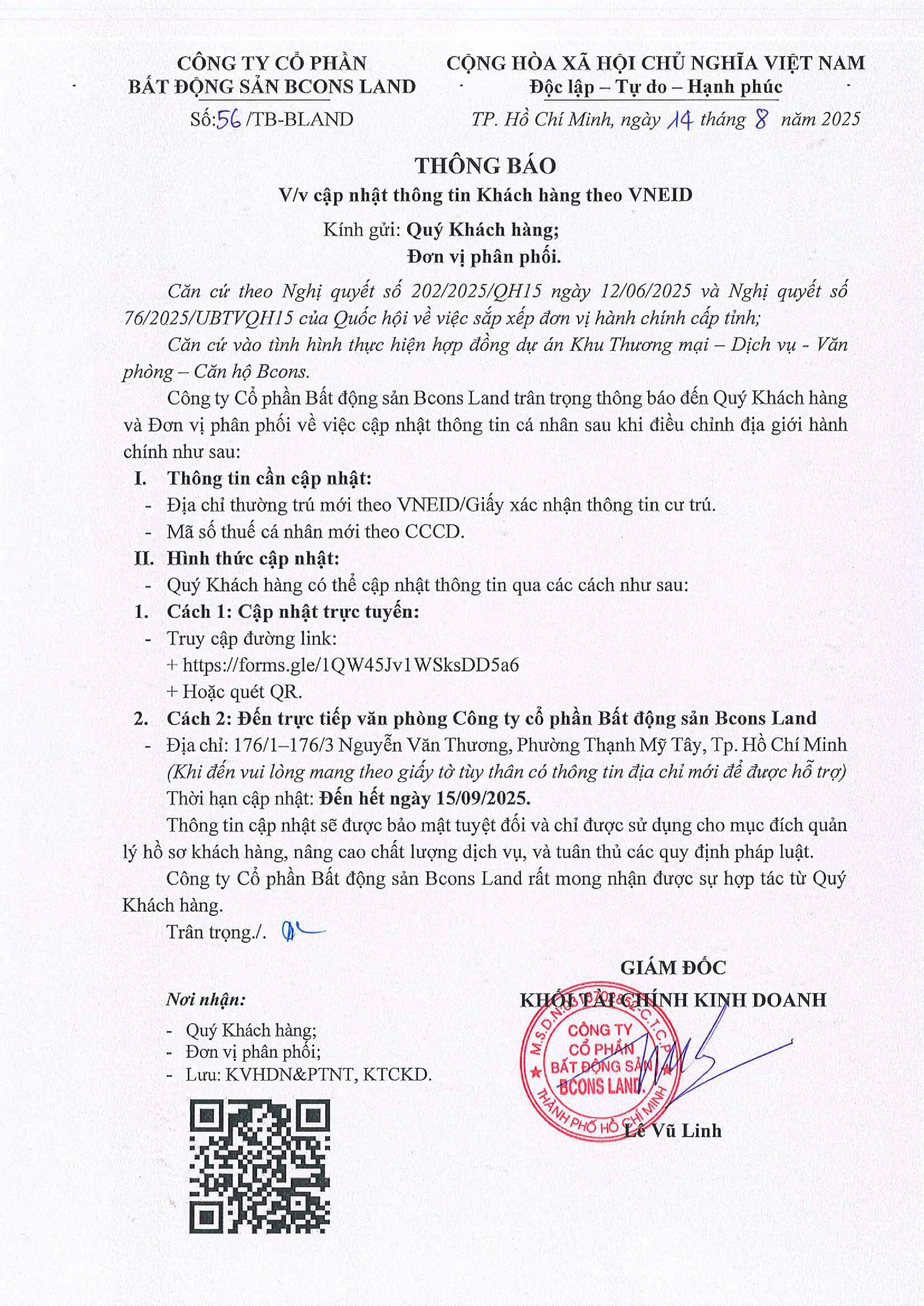 THÔNG BÁO CẬP NHẬT THÔNG TIN KHÁCH HÀNG THEO VNEID