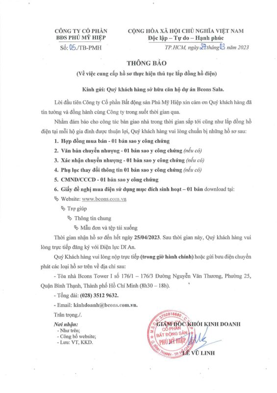 Tin tức, Tin tức dự án Thông báo cung cấp hồ sơ thực hiện thủ tục lắp đồng hồ điện dự án Bcons Sala Posted on 27 Tháng Ba, 2023 by Dương Thị Kiều Lam
