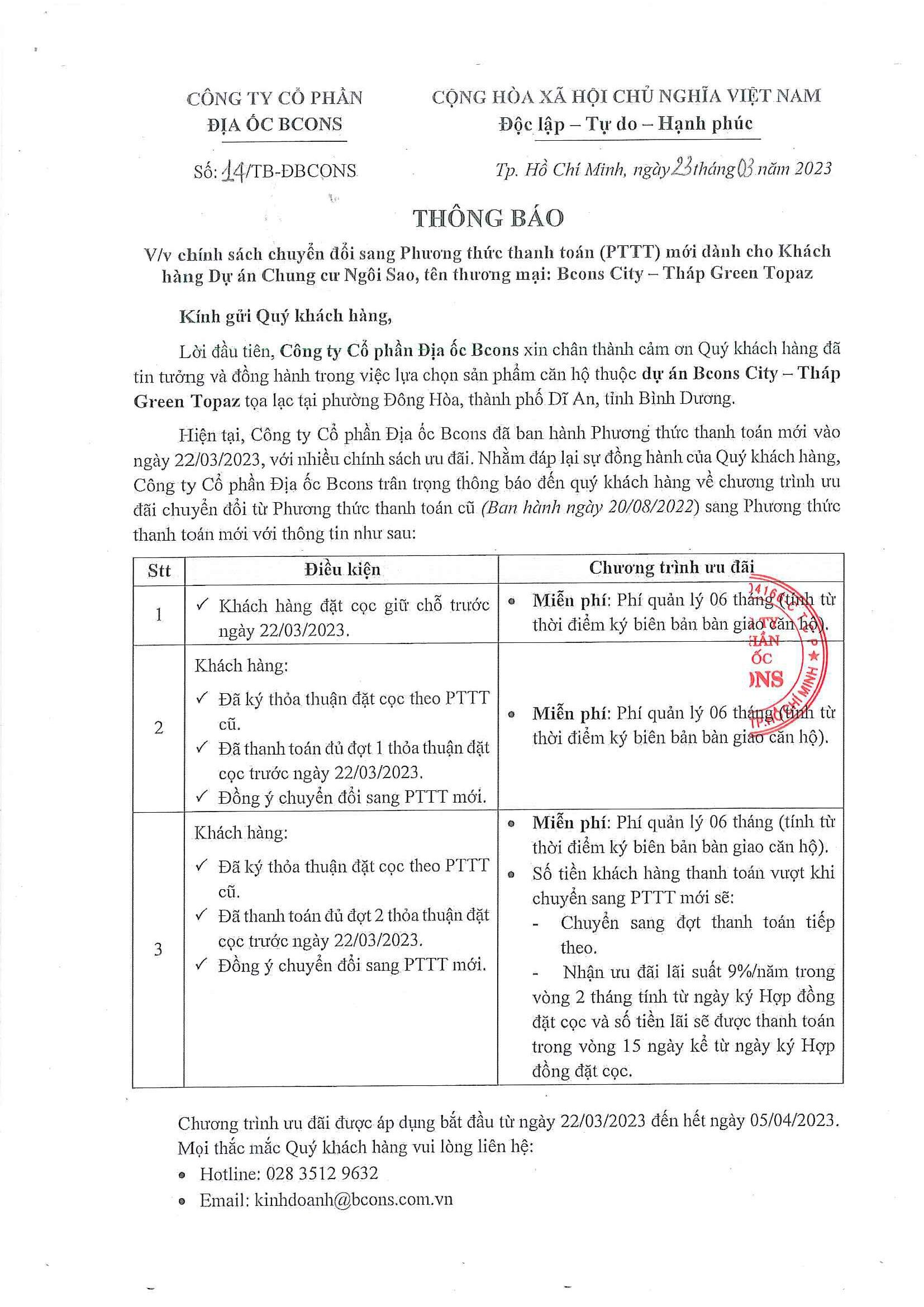 Thông báo thời gian kết thúc Chính sách chuyển đổi Phương thức thanh toán mới dành cho khách hàng Dự án Chung cư Ngôi Sao (tên thương mại: Bcons City – Tháp Green Topaz)