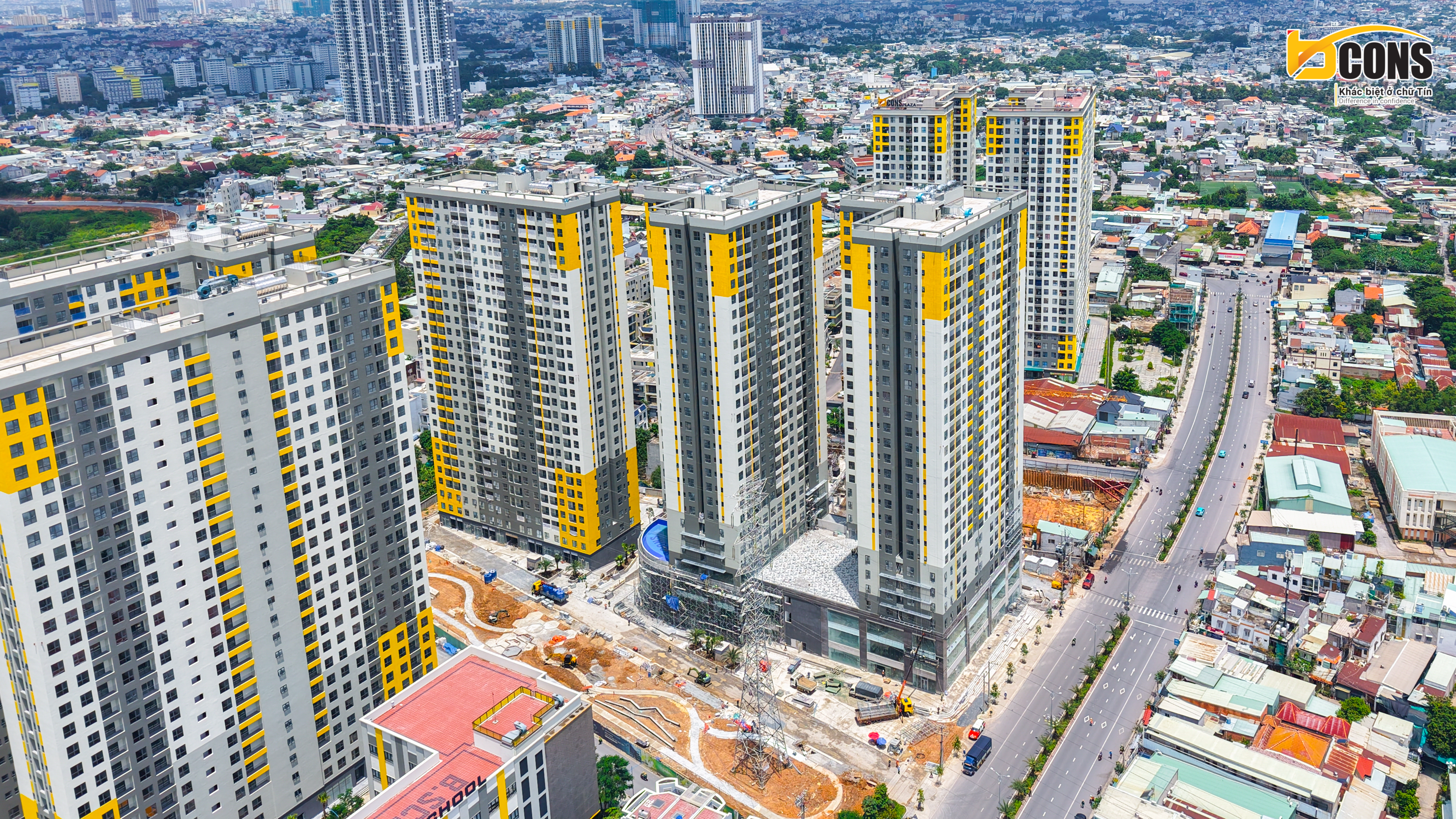 Tháp Bcons City đồng thời hoàn thiện sơn nước, ốp đá mặt tiền trung tâm thương mại và triển khai các hạng mục bên trong cũng như hạ tầng ngoài trời.