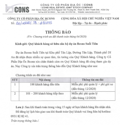 THÔNG BÁO (V/v: Chương trình ưu đãi thanh toán tháng 04/2020) Kính gửi: Quý ...